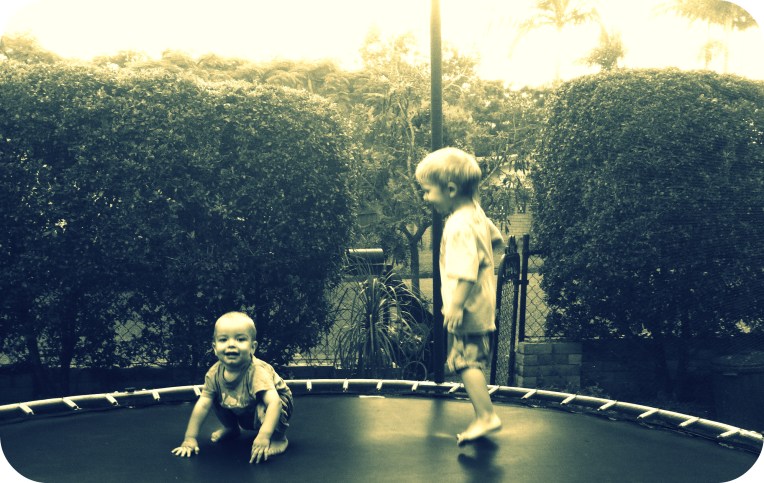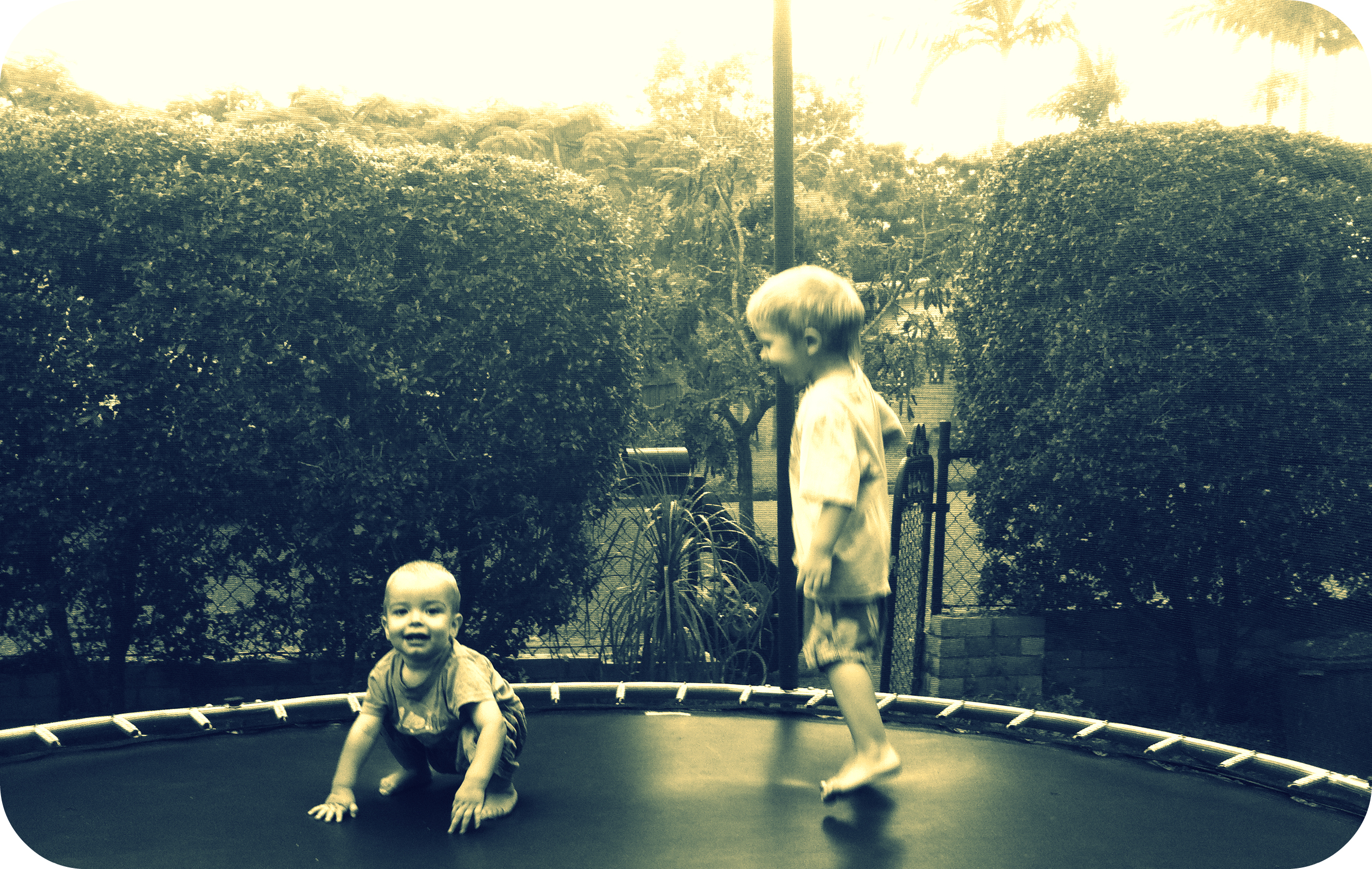 Oh you boys…! All you do is giggle everytime you jump on the tramp. Kardez you barely get to stay on your feet as Dacka jumps all around you. But you don’t mind! You just crawl over to mama and try and get through the gap in the zip when you’re ready to get out… So cute! xx